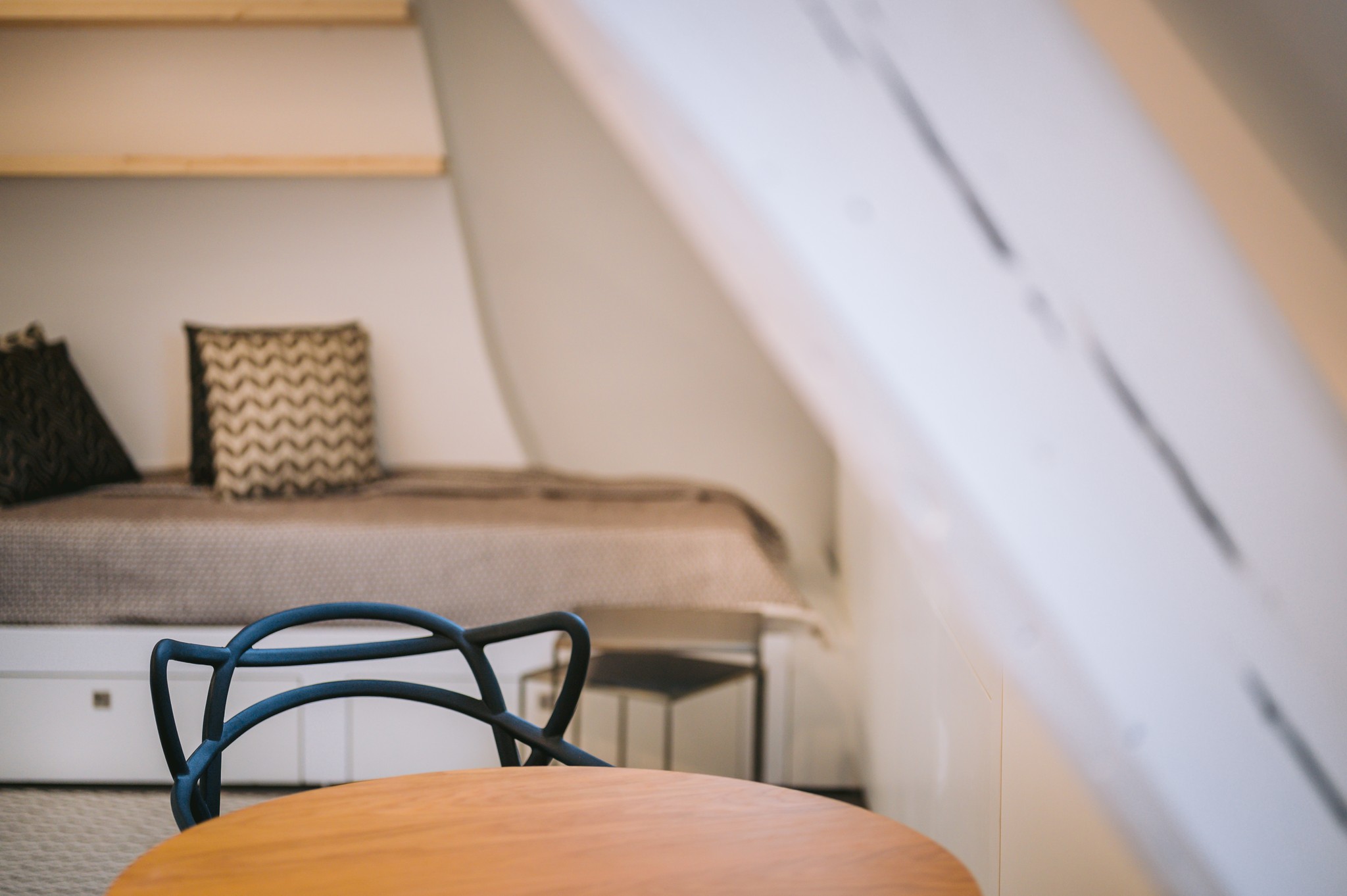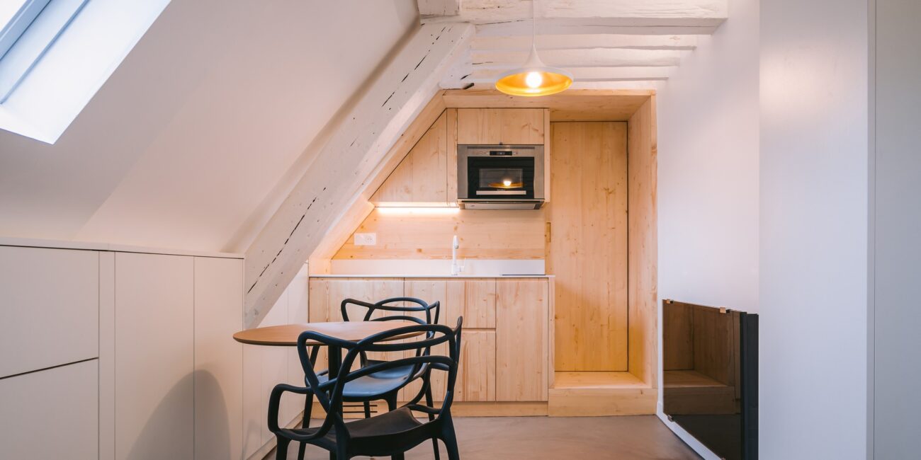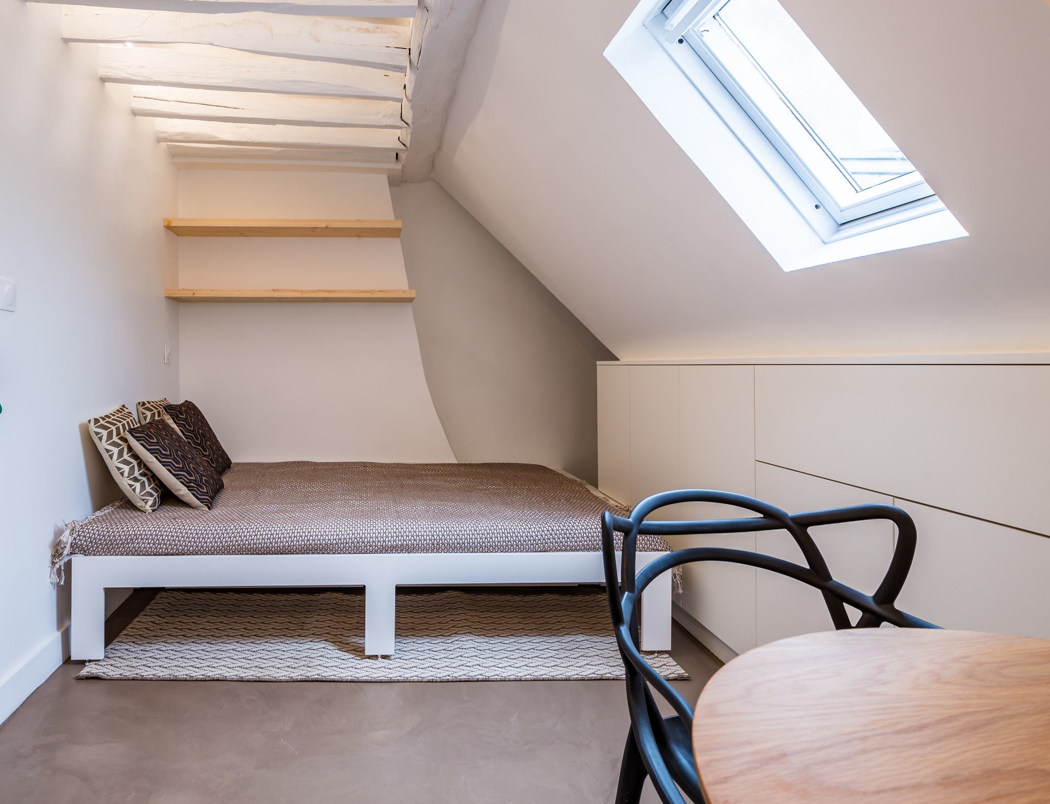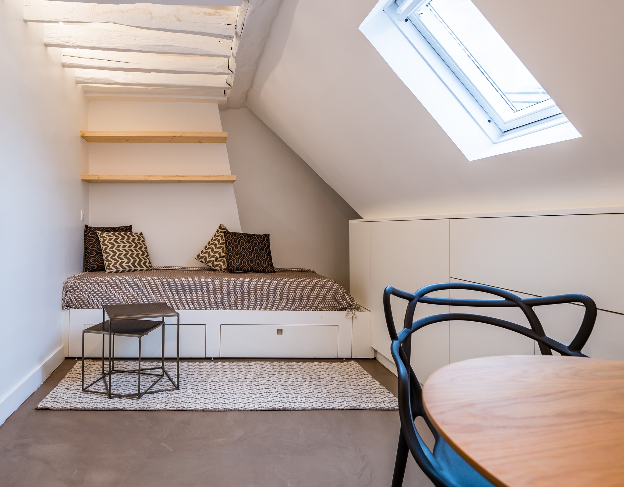 Restructuration et réunion de 3 chambres de services situées sous les toits d’un immeuble parisien – optimisation et création des espaces – architecture modulable – agencement / mobilier sur-mesure