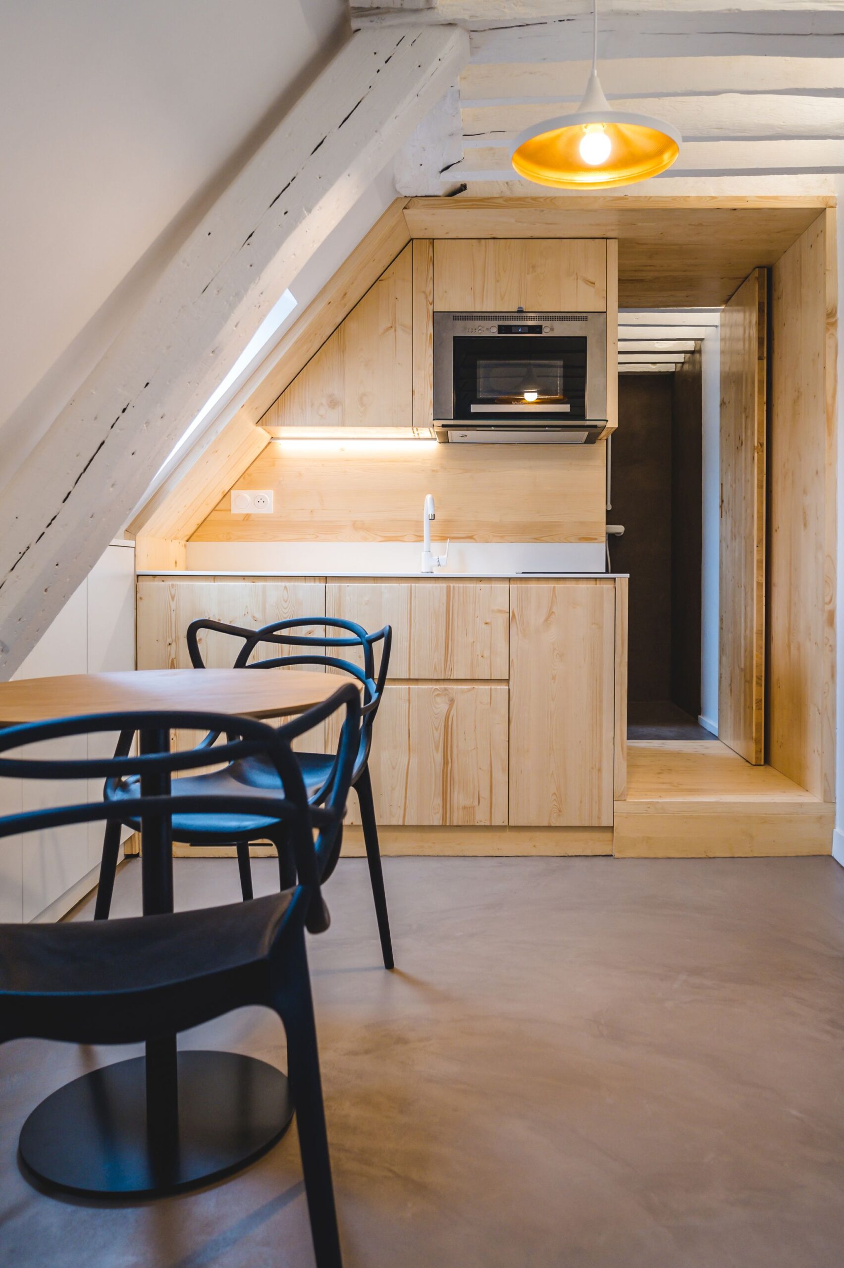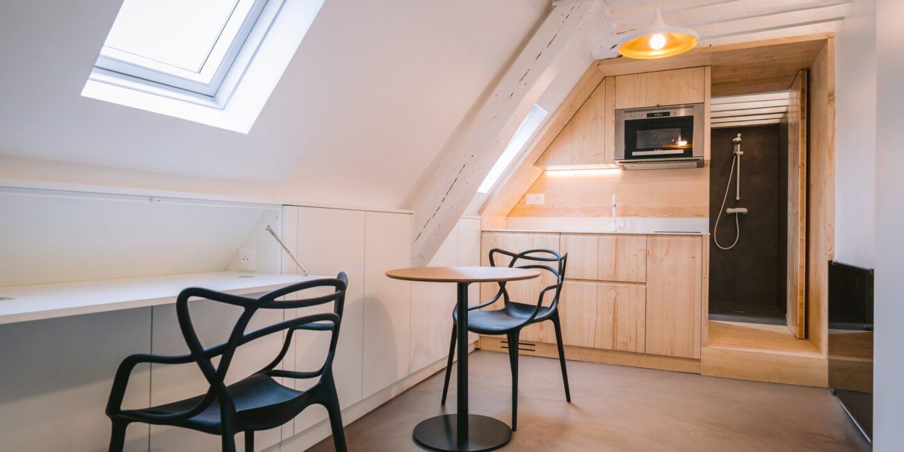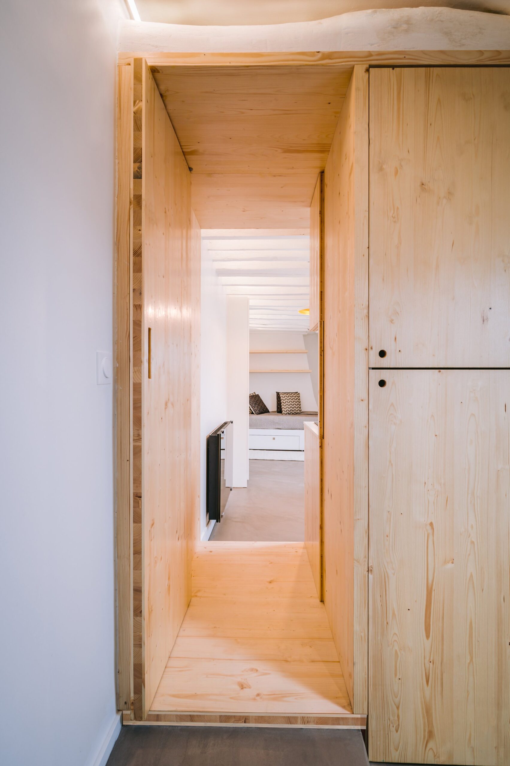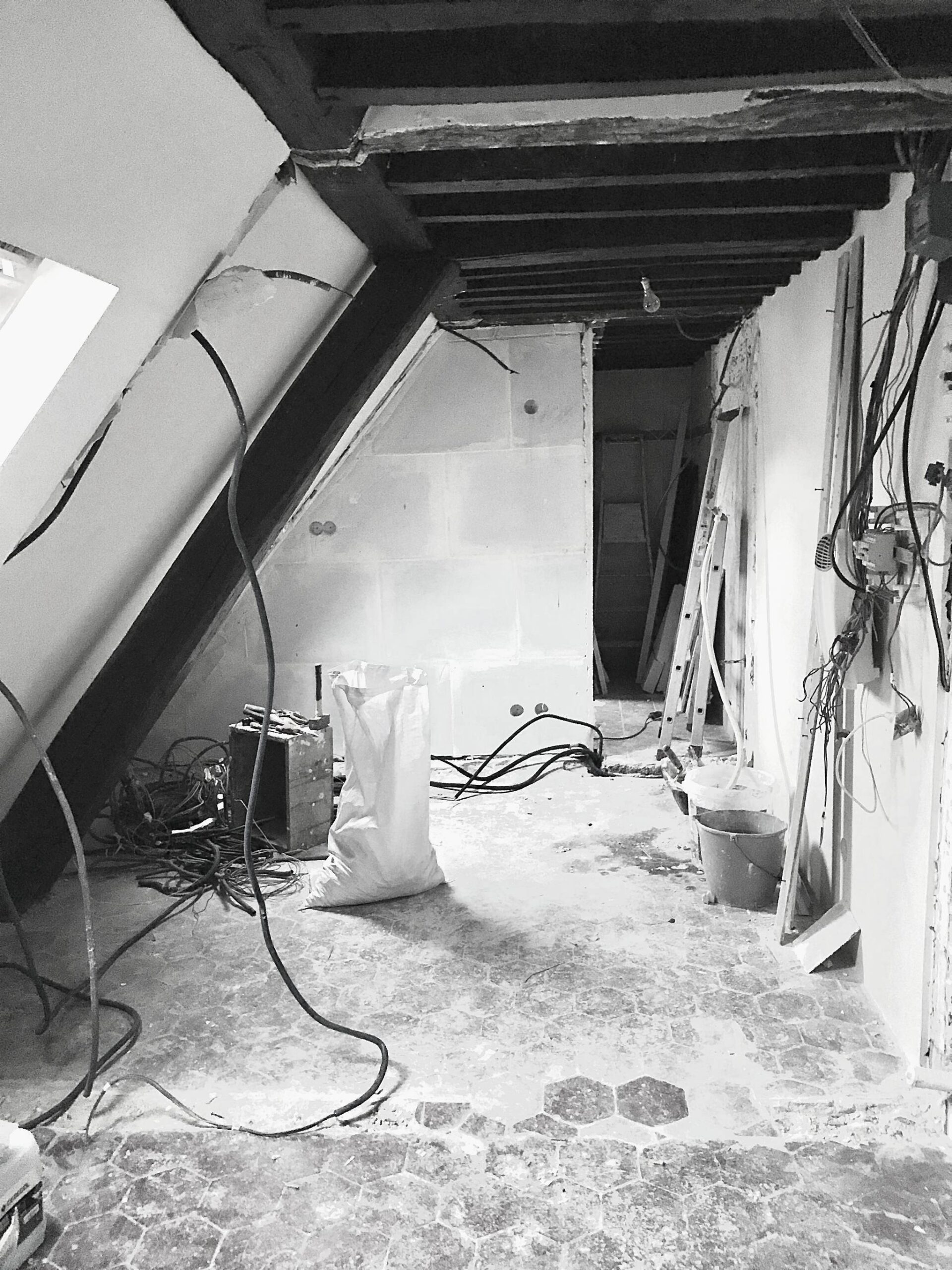 Restructuration et réunion de 3 chambres de services situées sous les toits d’un immeuble parisien – optimisation et création des espaces – architecture modulable – agencement / mobilier sur-mesure